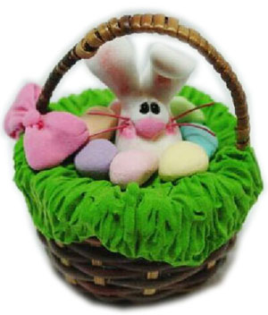 Bow - Make two triangles with pink clay and place the points together in the middle. Press into the grass off to the side of the basket. Add a small pink ball to the center.