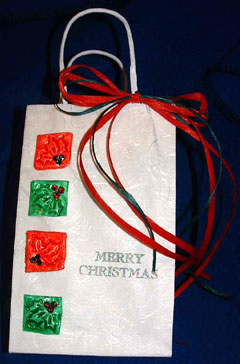 5. Cut white handmade paper to fit the front of the gift bag. Stamp with your choice of Seasons Greetings Stamp. Dilute the craft glue slightly, brush on to the front of the bag and affix white handmade paper to the front of the bag. Glue the four (4) Delight™ images horizontally on the bag. Tie red and green Wraphia to one of the handles of the bag.