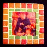 5. Tacky glue should still be somewhat sticky, but if it's completely dry, spread a little glue under tile area. Press rust tiles to lid around outer frame as shown, then fill in inner area with 'half' green tiles. Allow clay to dry.