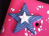 8. Cut textured stars from deep blue clay (see step 2 of Blue Switchplate below) and secure using a thin layer of glue on the back of star. Highlight the raised star texture with Pearl Ex powder on fingertip.